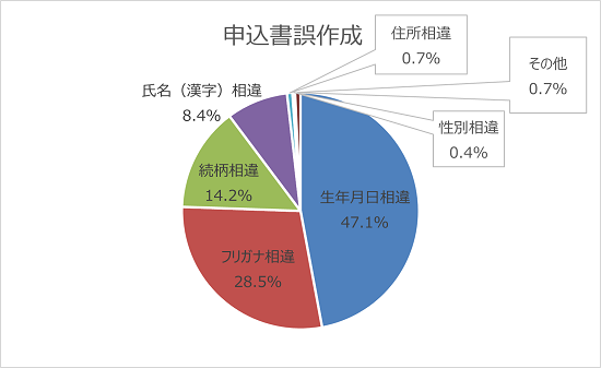 「申込書誤作成」全体では、生年月日、フリガナの間違いが多く、生年月日とフリガナで全体の