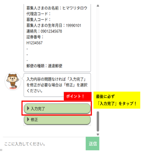 チャットボット受付で手続きを進める際、最後に「入力完了」を選択しないまま