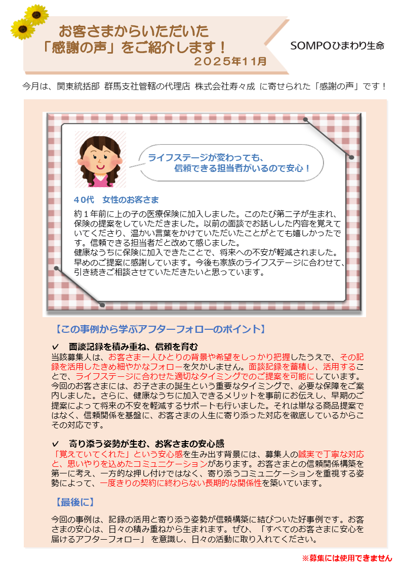 今回ご紹介する「感謝の声」は、お客さまのライフステージの変化に寄り添いながら、いかにして信頼関係を築き、「安心」を提供できたかという素晴らしい事例です。日々の活動におけるアフターフォローの重要性と、お客さまとの信頼関係を深めるヒントが詰まっていますので、ぜひご覧ください。