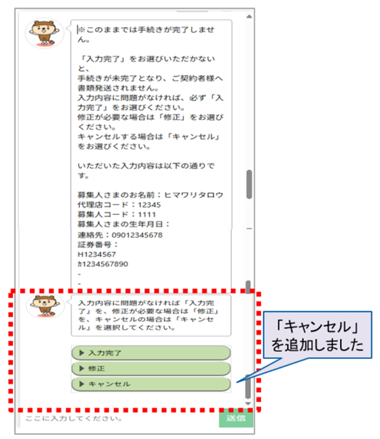 入力完了ボタン押下漏れによる手続き未完了が発生していますので、