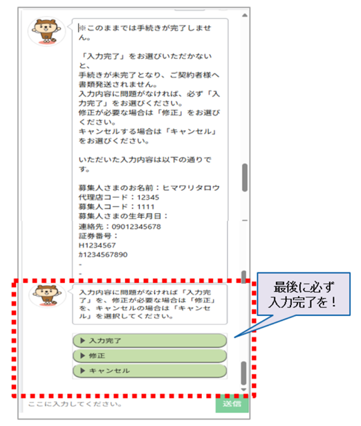 最後に必ず入力完了ボタンを押下し、入力完了となったことを確認してください。