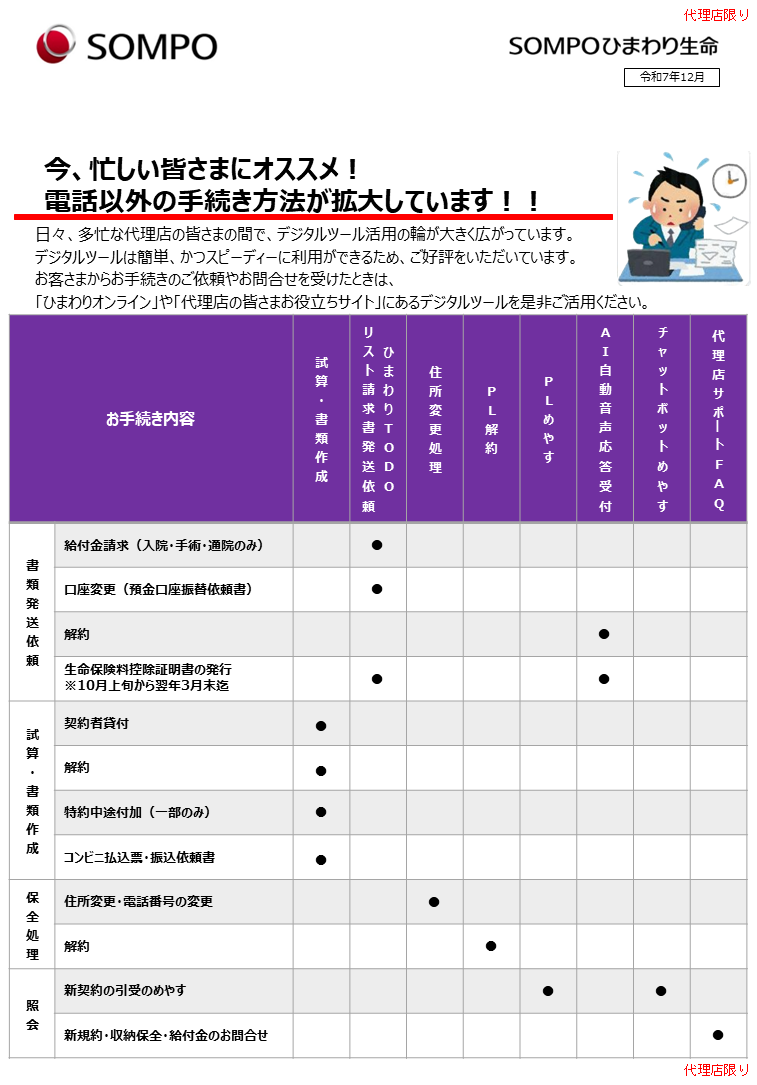 今回ご紹介する 「代理店向けデジタルツール一覧チラシ」 は、お客さまからお手続きのご依頼や