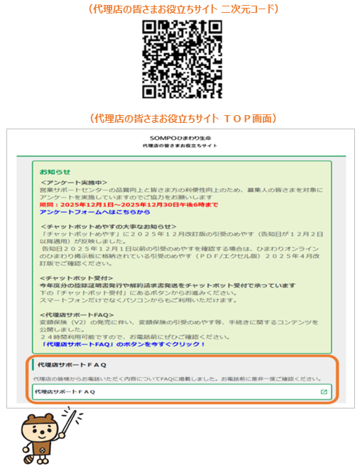 以下の二次元コードを読み取り、「代理店の皆さまお役立ちサイト」TOPページから