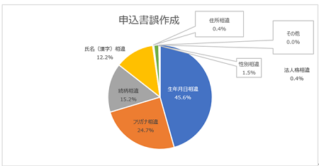 「申込書誤作成」全体では、生年月日、フリガナの間違いが多く、生年月日とフリガナで全体の