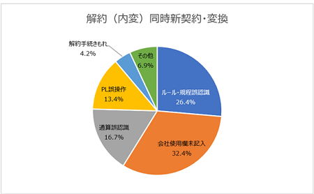 「解約(内変)同時新契約・変換」の原因では、「ルール・規定誤認識」が26.4% と最も多くなっています。