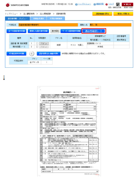 <画面および内容>※弊社の変額保険を募集する際は、原則、弊社の「適合性確認シート」を使用いただきますが、「代理店独自の帳票」を使用して適合性を確認する場合、確認項目が弊社の適合性確認シートの確認項目を充足していれば、引き続き「代理店独自の帳票」をご使用いただけます。