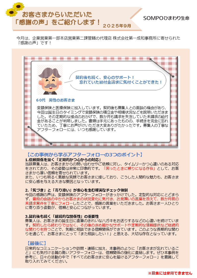 お客さまからいただいた「感謝の声(9月号)」をご紹介します! 文書番号250283 いいね0 作成部署FD推進部 公開日2025年9月30日 今月は、企業営業第一部本店営業第二課管轄の代理店 株式会社第一成和事務所に寄せられた「感謝の声」です!