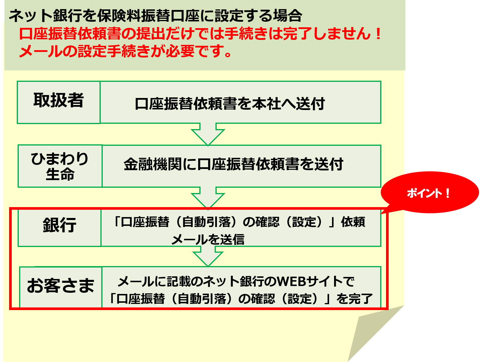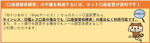 銀行ウェブサイトでの口座設定手続きのお願い(契約者用チラシ) 文書番号220337 いいね0 作成部署契約サービス部業務企画G 公開日2022年12月21日 更新日2024年11月27日 ◆口座振替依頼書でサインレス・印鑑レス口座をご指定されるお客さま向けのチラシです。 ◆口座振替依頼書の提出後の手続きの流れやポイントを掲載していますので、口座変更の手続き時に活用して ください。 ◆既契約の口座変更だけでなく、申込時の口座登録にも使用できます。 ※チラシはA4横2枚です。カラーコピーをしてご使用ください。